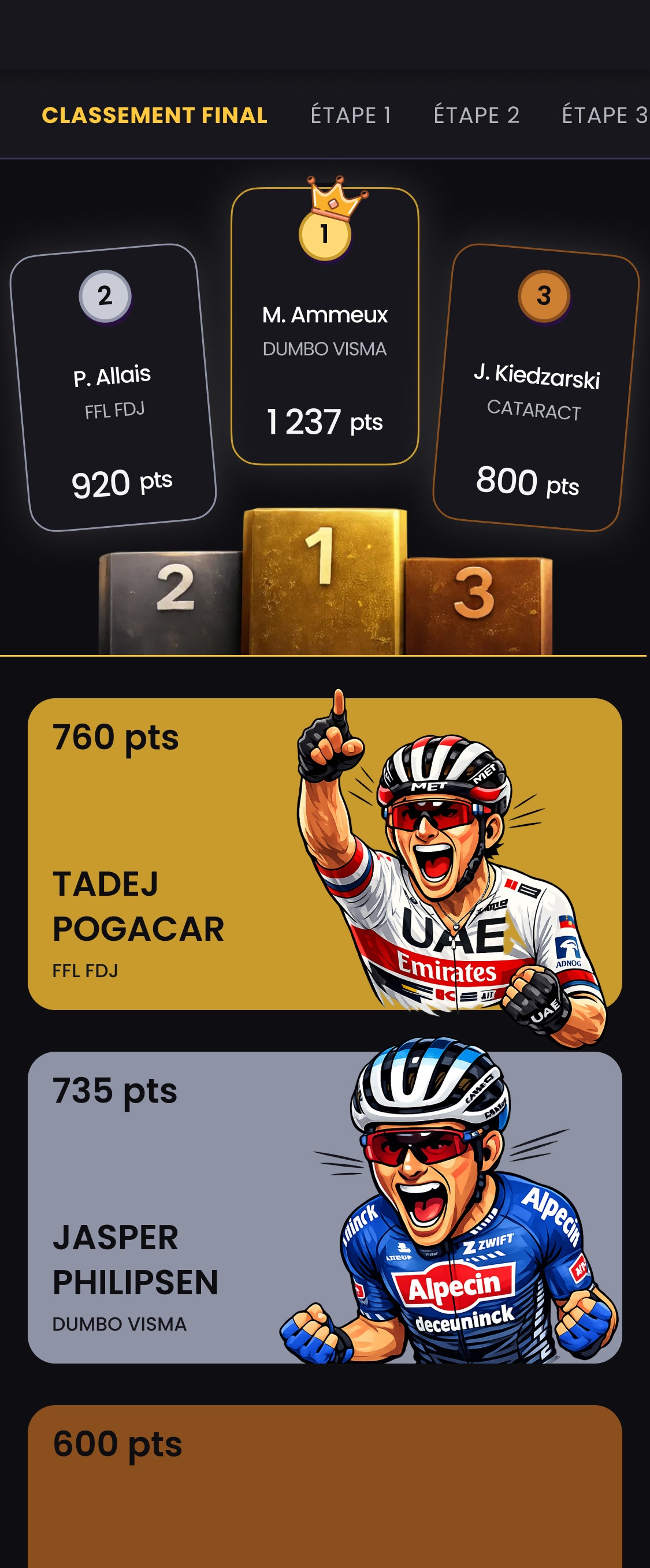 À utiliser avant midi le jour de l'étape, ils vous permettront de mettre en avant votre flair. En l'utilisant à bon escient, vous mettez des bâtons dans les roues de vos adversaires, et vous sublimez vos favoris !